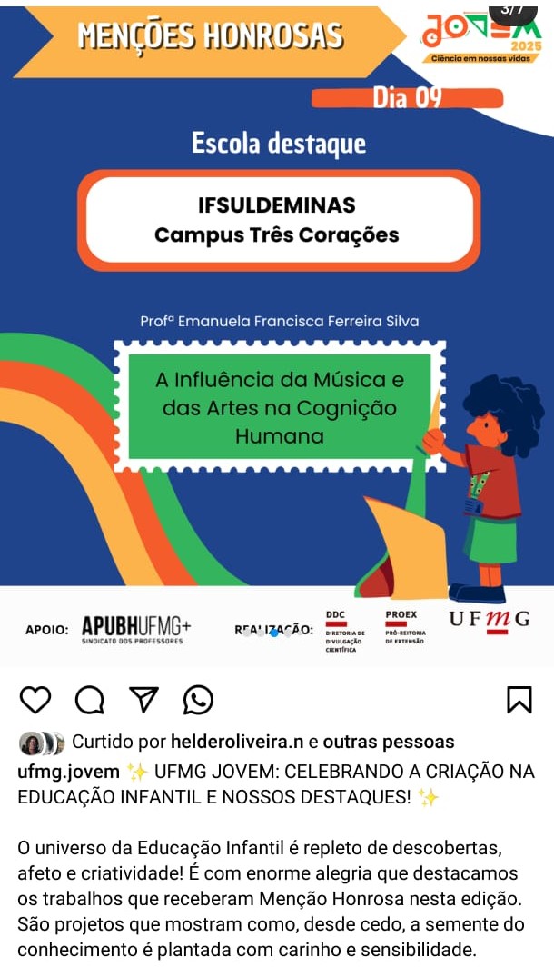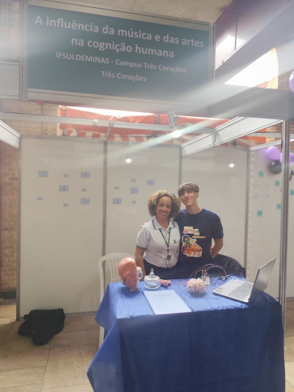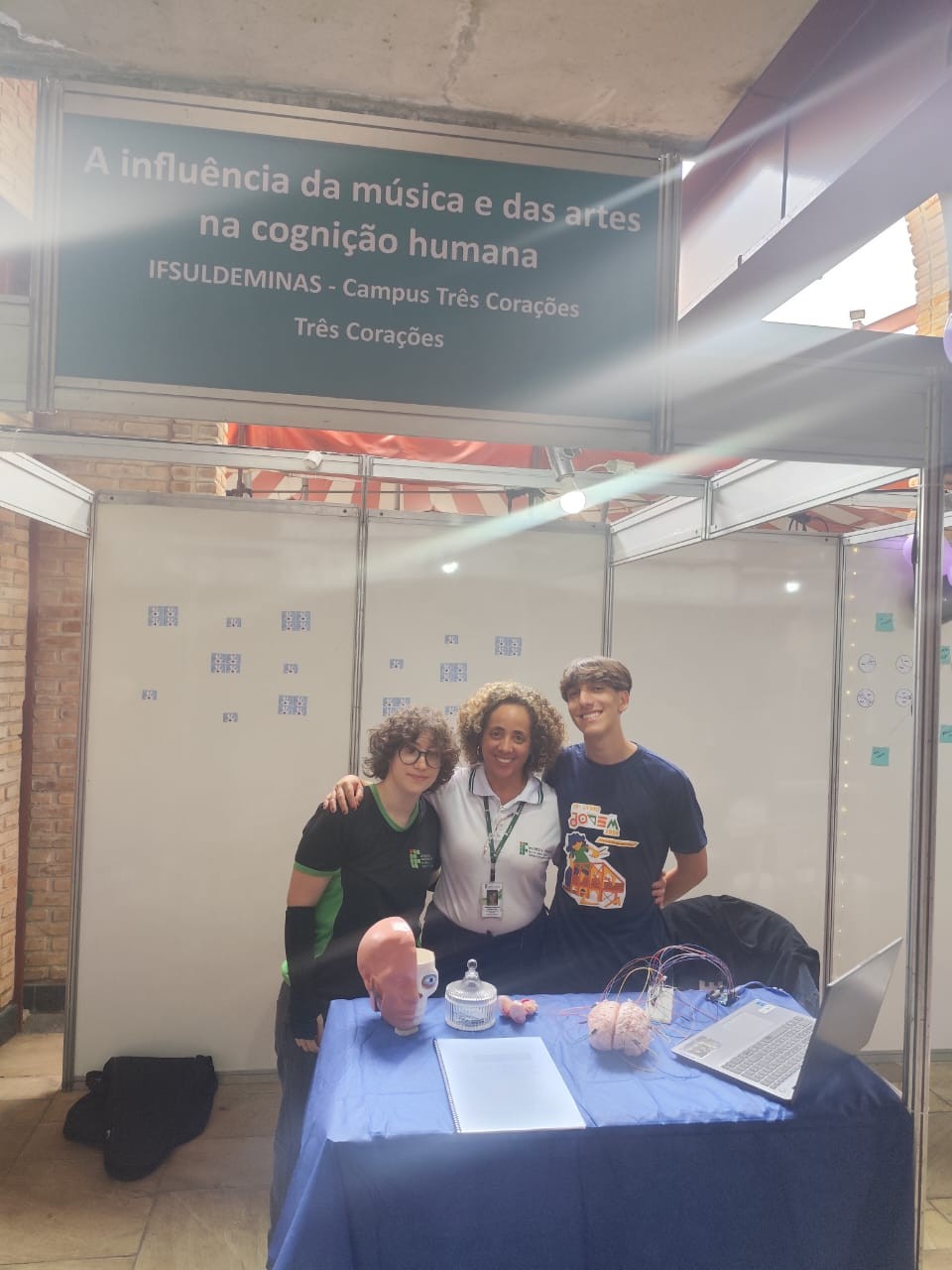 No dia 9 de outubro de 2025, o Instituto Federal do Sul de Minas – Campus Três Corações participou da 26ª edição da UFMG Jovem – Feira de Ciências com um projeto sobre música e cognição. A professora Emanuela Francisca Ferreira Silva e os bolsistas do PIBIC-EM/CNPq Luis Otávio Albrecht Perroni e Brenda Vitória Barbosa de Oliveira apresentaram o trabalho “A influência da música e das artes na cognição humana”, resultado de pesquisa desenvolvida no biênio 2024-2025 sobre a importância da música e de projetos culturais no desenvolvimento cognitivo e emocional dos estudantes.